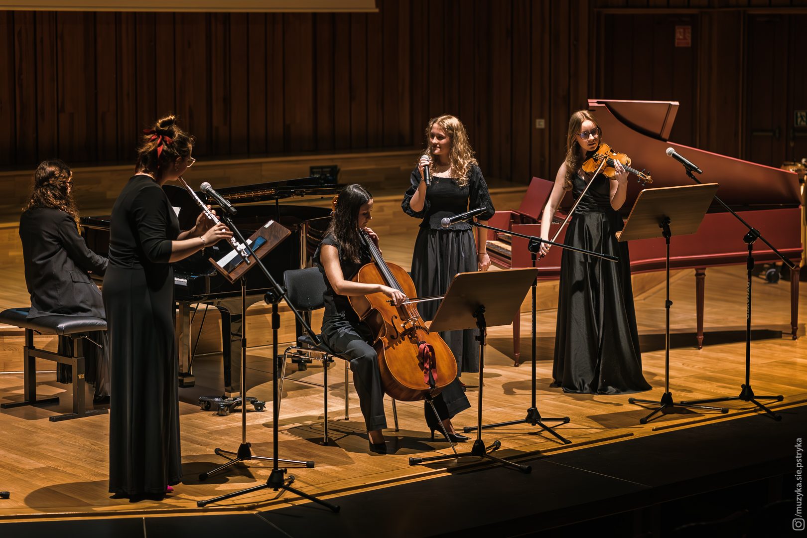 Na świątecznej scenie wystąpiło pięć tegorocznych stypendystek: Agata Bomik (z klasy klawesynu Urszuli Jasieciej-Bury), Oliwia Królczyk (z klasy skrzypiec Piotra Chromca), Joanna Parzyk (z klasy fletu Doroty Parzyk), Emilia Wybraniec (z klasy rytmiki Joanny Polachowskiej i fortepianu Eweliny Dereń-Rogóż) i Maya Pisek (z klasy wiolonczeli Agaty Moszyńskiej-Pyc). Dziewczęta zaprezentowały wirtuozowski solowy repertuar złożony z utworów z różnych epok, reprezentujących różne formy muzyczne. Możne było usłyszeć pogodny koncert fletowy Carla Stamitza, tajemniczy koncert wiolonczelowy Edwarda Elgara czy zaskakujący Polonez Brillante Henryka Wieniawskiego. Nie zabrakło też współczesnej twórczości - wykonano One harpsichord Martijna Paddinga oraz Balladę na flet i fortepian autorstwa Emilii Wybraniec.