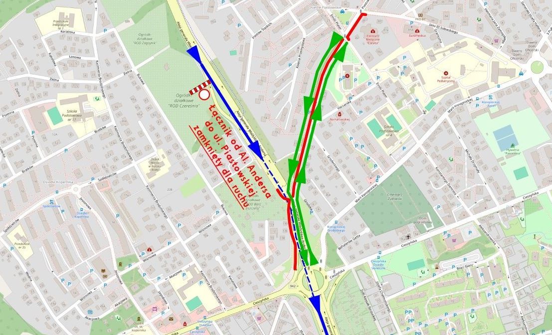 Od dzisiaj (17 listopada) przez około 7 tygodni będzie obowiązywać zmieniona organizacja ruchu na ul. Piastowskiej w rejonie ronda Hulanka. Na czas prac zamknięty zostanie łącznik pomiędzy al. gen. Władysława Andersa, a ul. Piastowską.