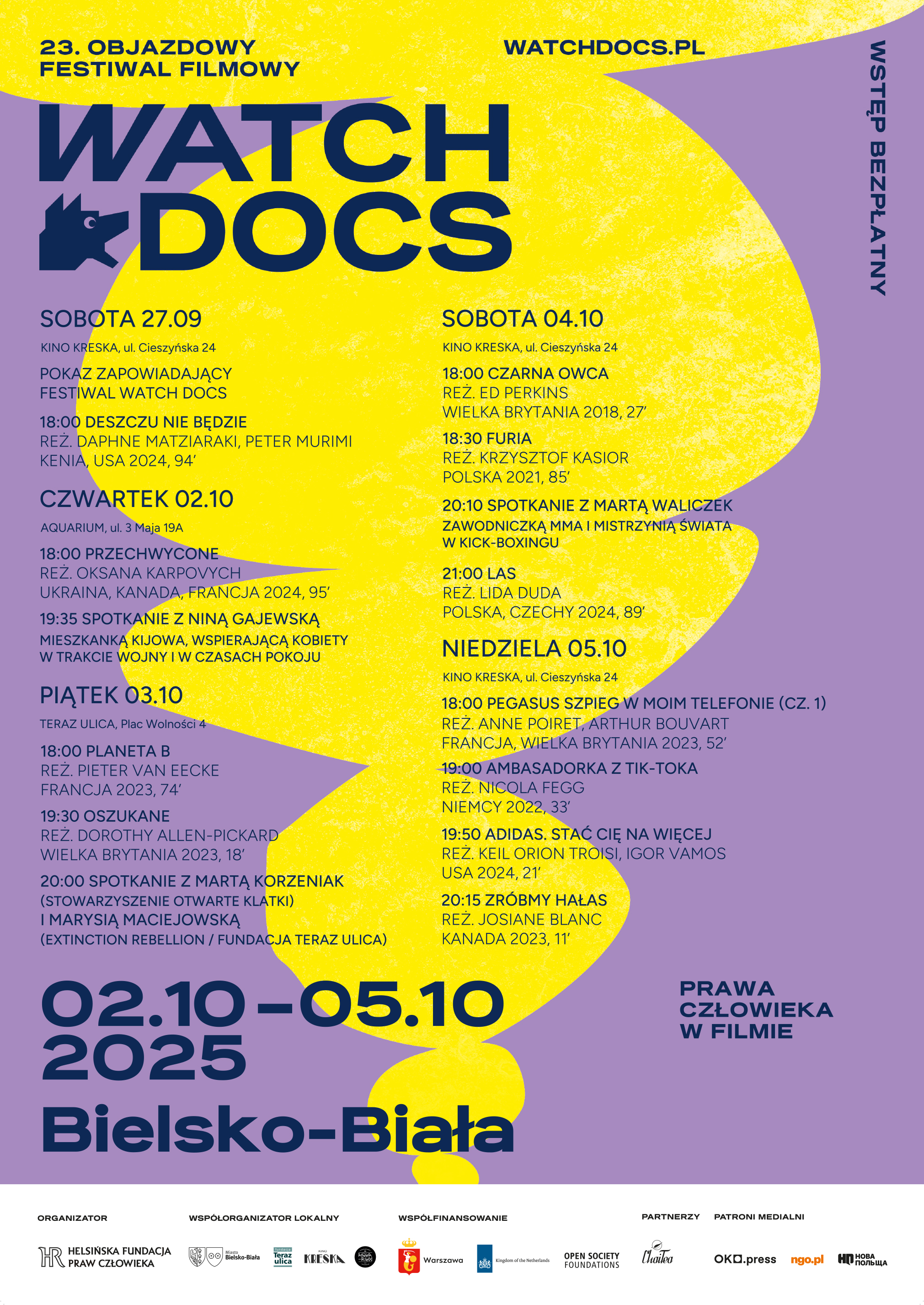 Szczegółowy program festiwalu na stronie: https://watchdocs.pl/festiwal-objazdowy/jesien-zima-2025/bielsko-biala oraz w załączniku.